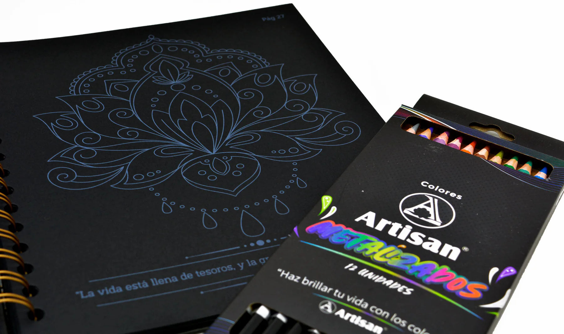 mandalas para colorear black – arterapia – libro para colorear con más de 35 mandalas + caja de colores pasteles x 12 artisan, además cada mandala tiene frases de motivación.