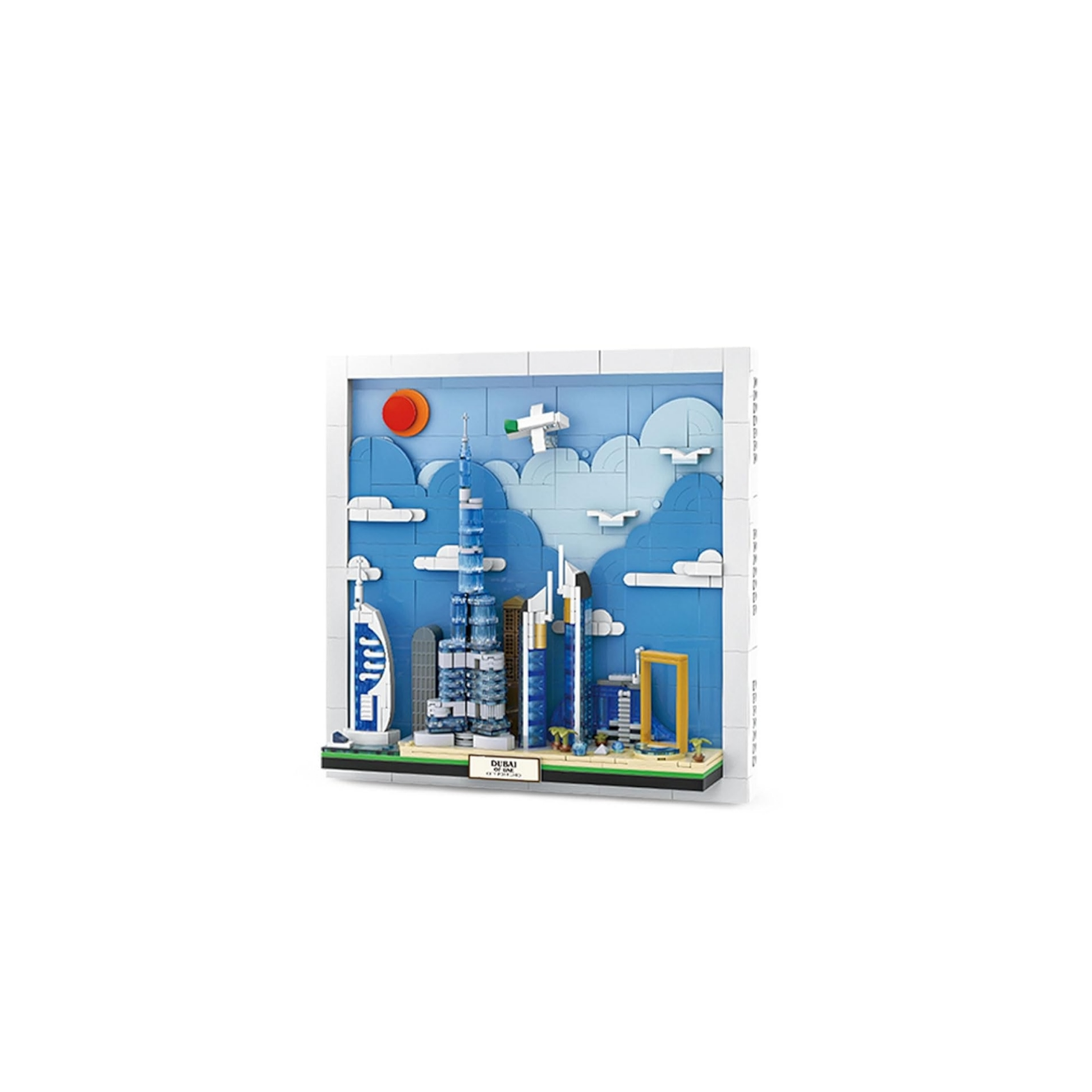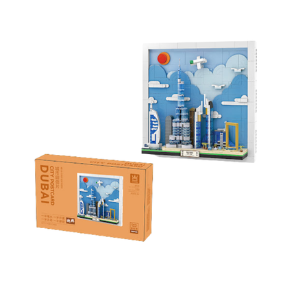 El "WANGE POSTCARD CITY POSTAL DUBAI" es un juguete de construcción de la marca Wange, que recrea a la ciudad de Dubái a través de bloques pequeños. Su nombre sugiere que su forma final podría parecerse a una postal o una maqueta, diseñado para armar y encajar.