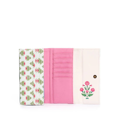 Billetera grande inspirada en la colección indian garden . Interior estampada con compartimientos para tarjetas y ID.