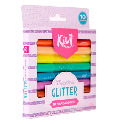 Blíster con 10 piezas de marcadores Glitter. Cada marcador contiene colores brillantes con finas escarchas de Glitter y punta tipo bala. ¡Dale brillo a tus notas! Consejo Kiut: Antes de usarlos, mantenlos con la tapa hacia abajo unos segundos (no es necesario agitarlos), cuando termines de usarlos asegúrate de mantenerlos en posición horizontal.