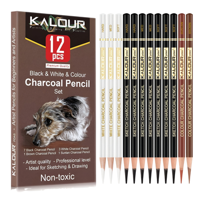 Juego de 12 lápices de carbón blanco, negro y marrón KALOUR para dibujar, sombrear, difuminar y usar con tiza para principiantes y artistas.