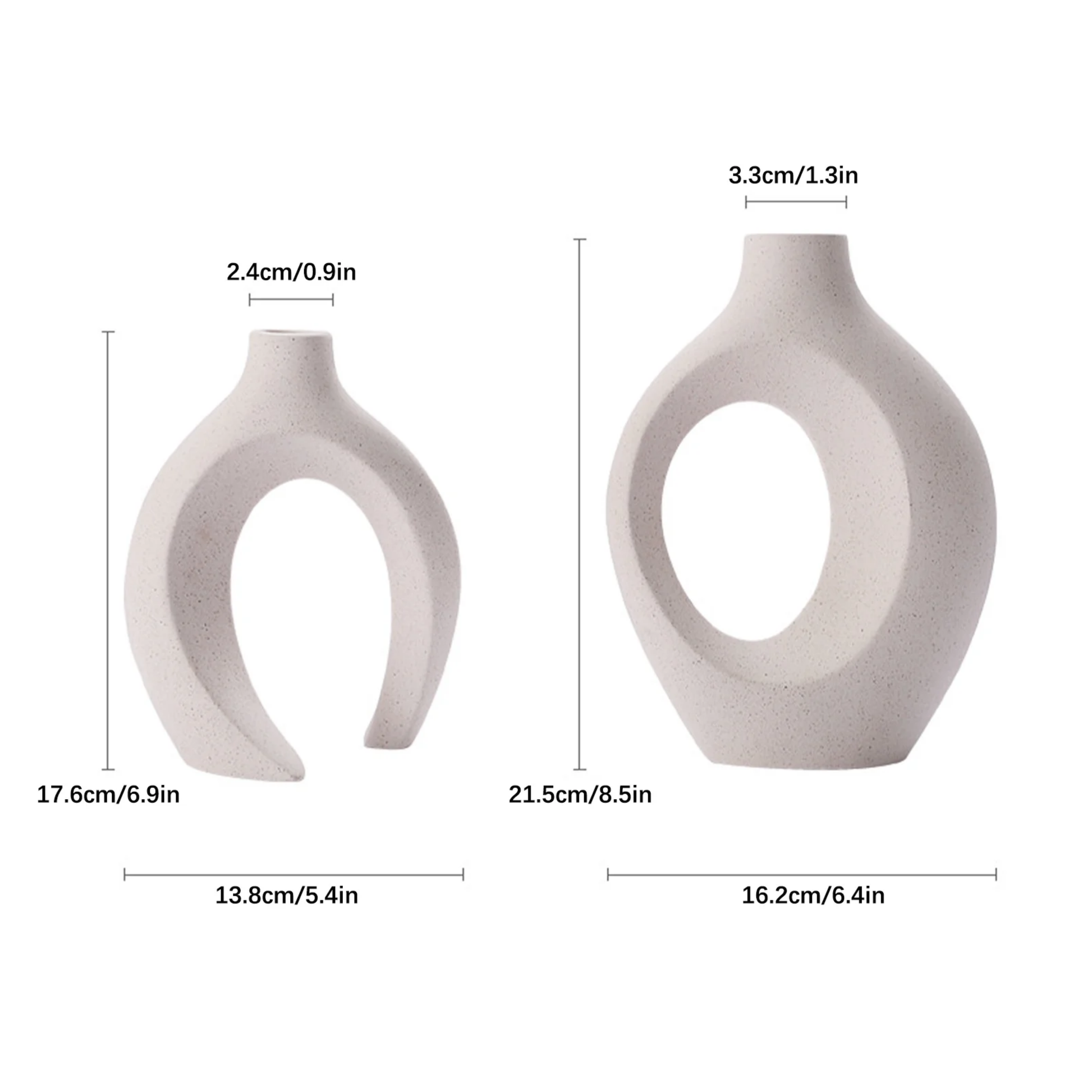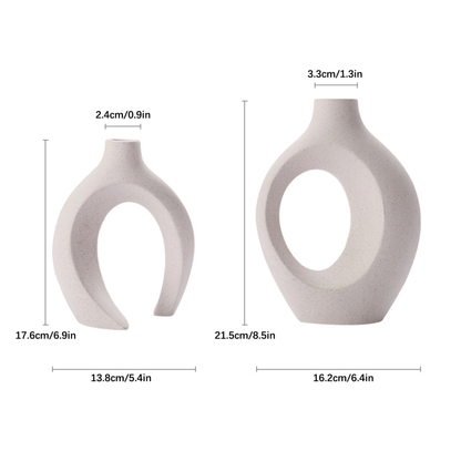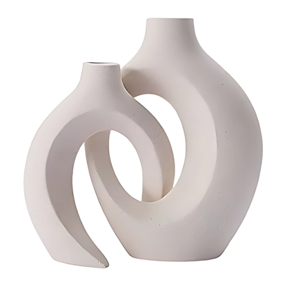 Set de dos floreros decorativos de cerámica entrelazados con opción de usar por separado de color hueso.