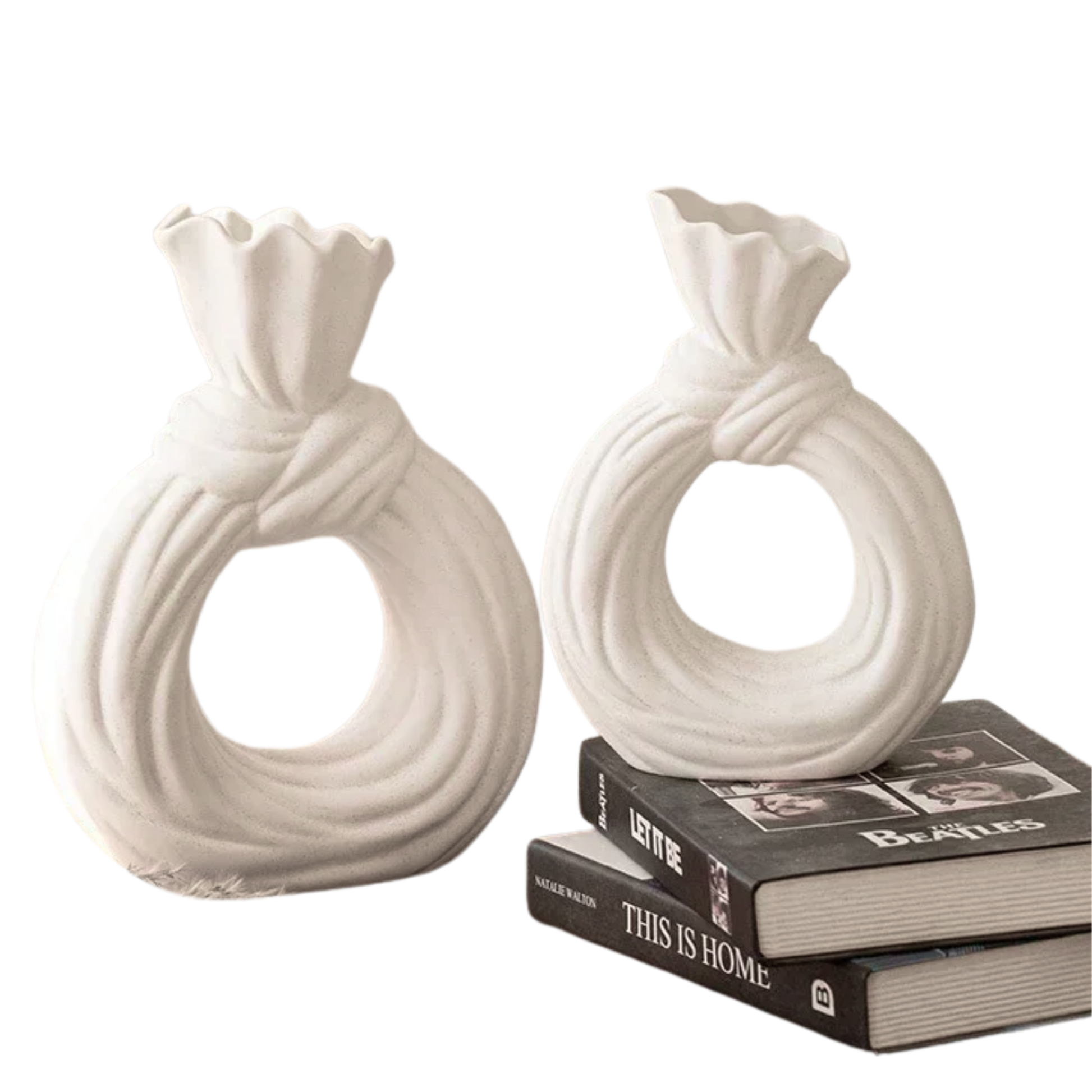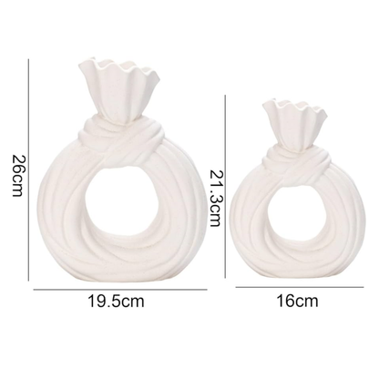 Set de dos floreros decorativos de cerámica en forma de lazo de color hueso.