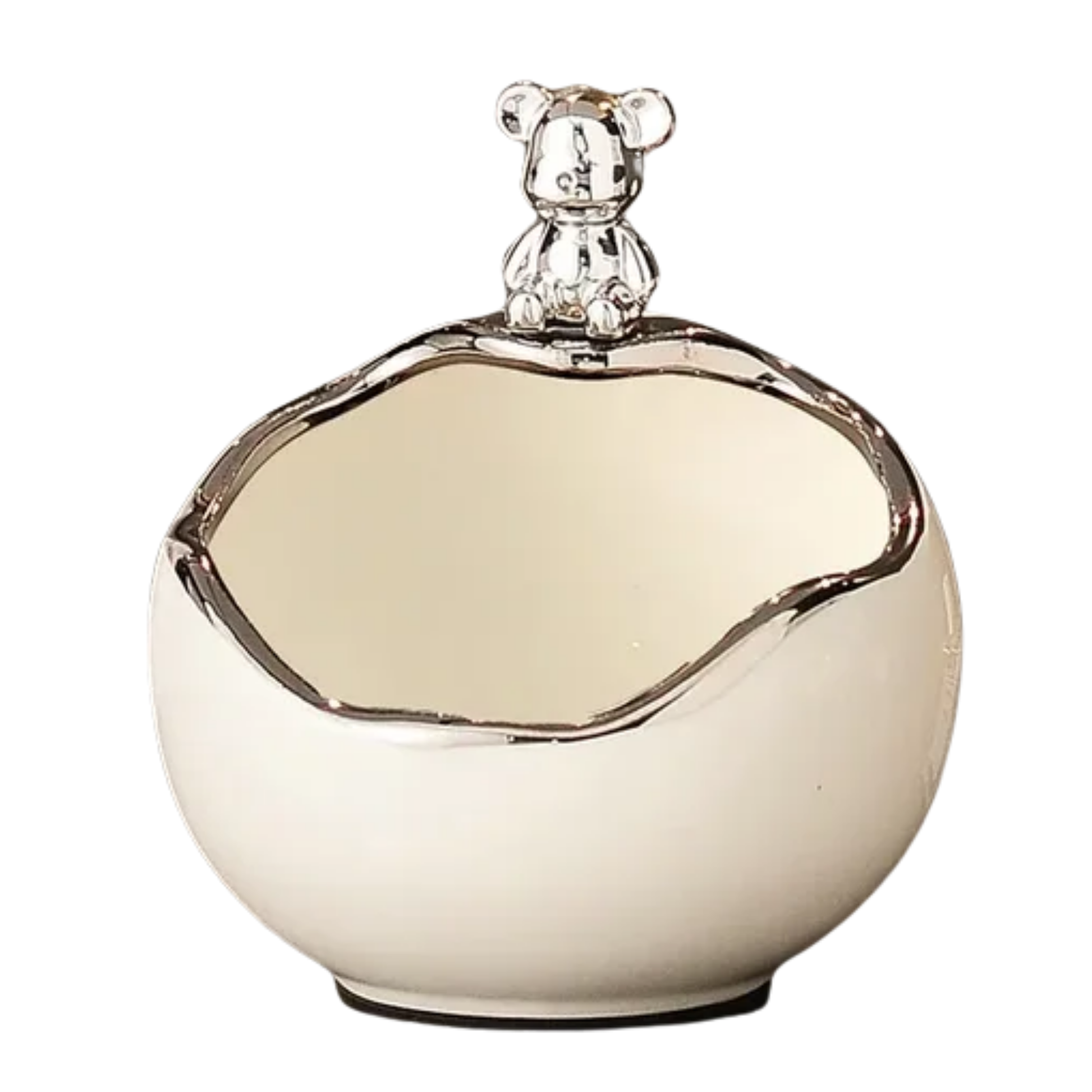 Figura decorativa de cerámica base color beige brillante con borde plateado y con adorno de oso plateado.