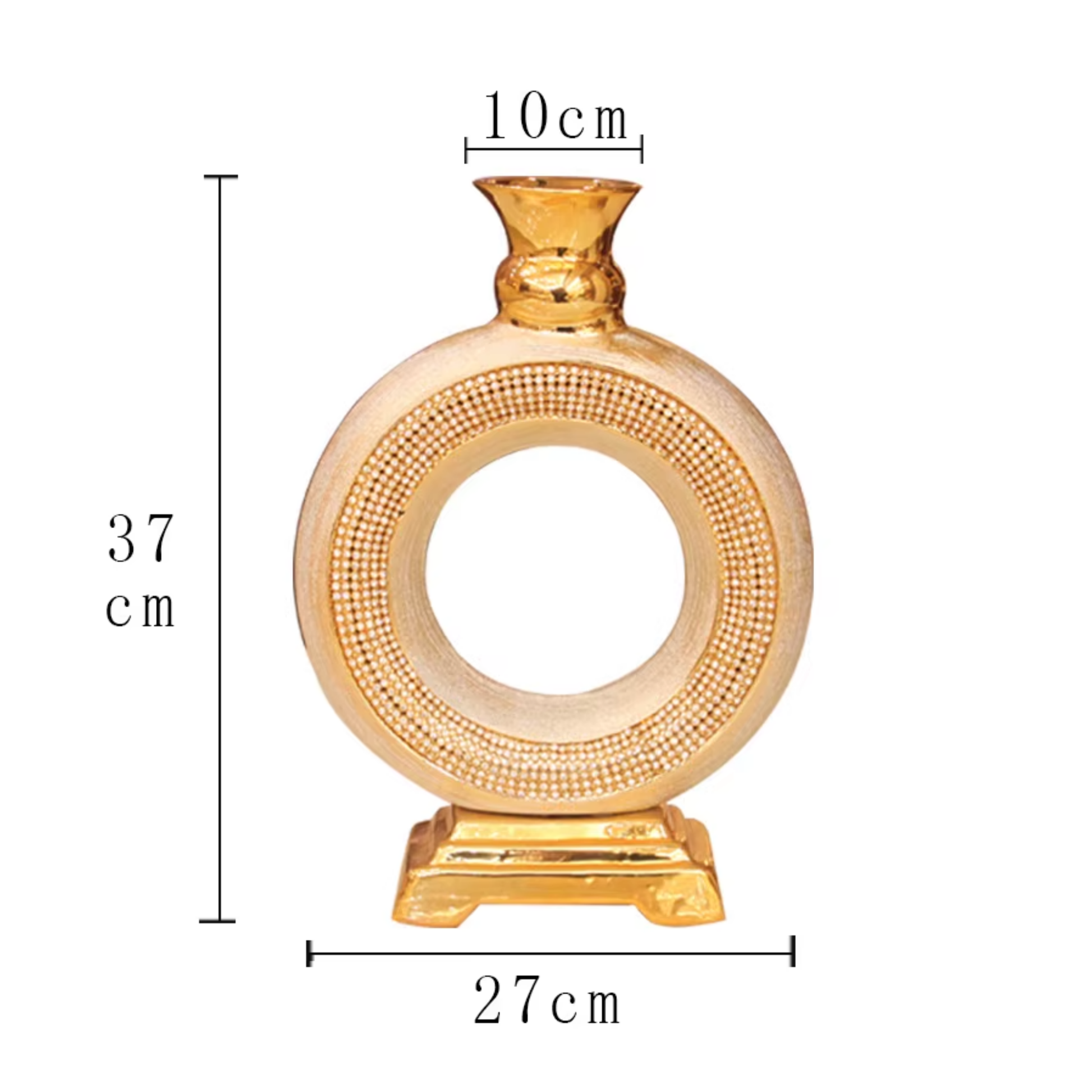 Jarrón decorativo en cerámica de color dorado con brillantes de 37 centímetros de alto por 27 centímetros de ancho.