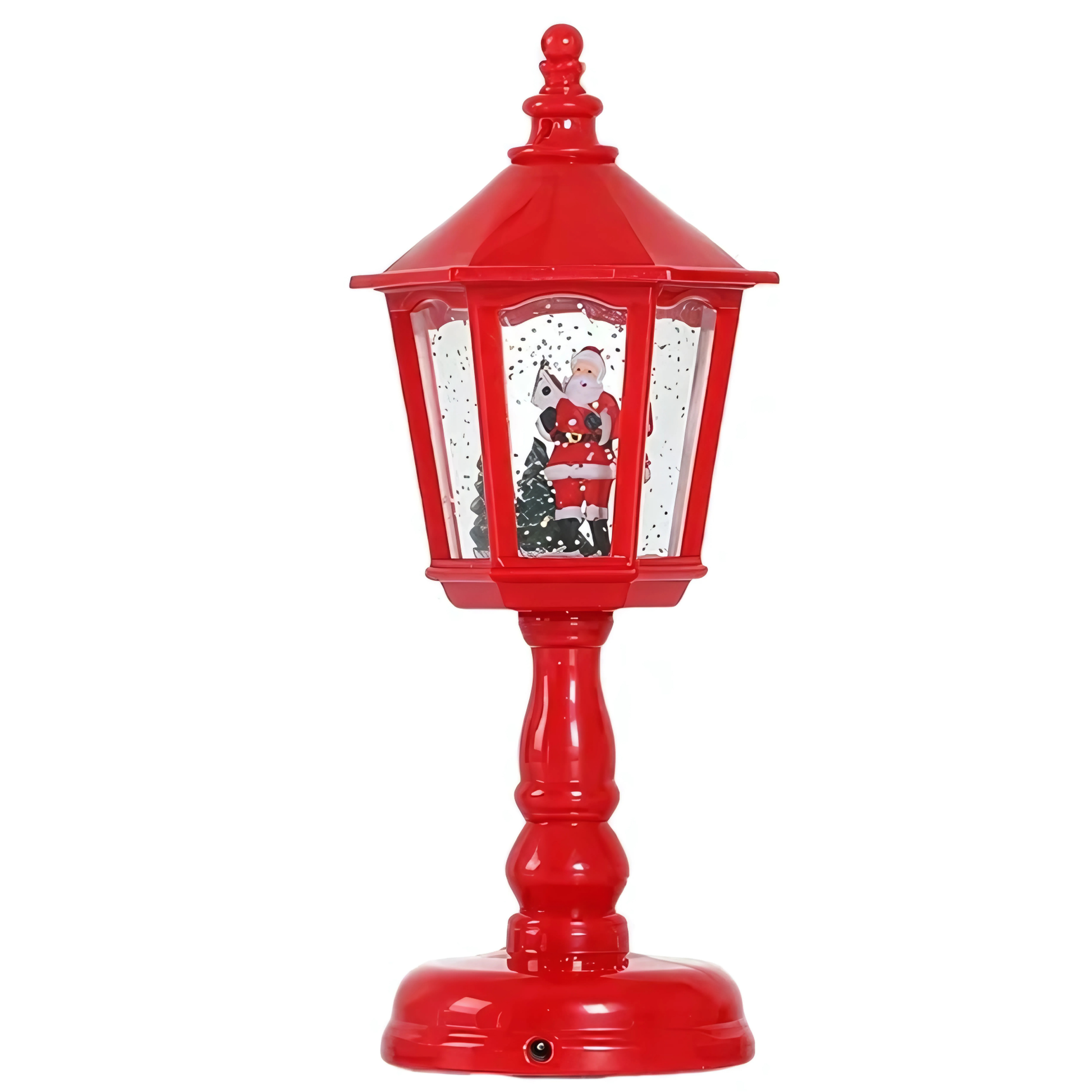 Lámpara navideña en forma de farol de color rojo con música y diseño de Santa Claus.