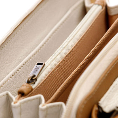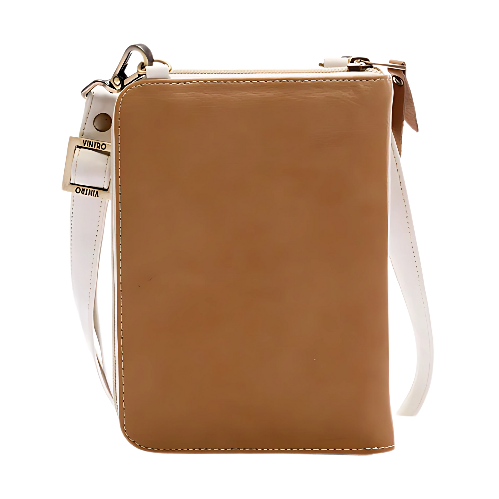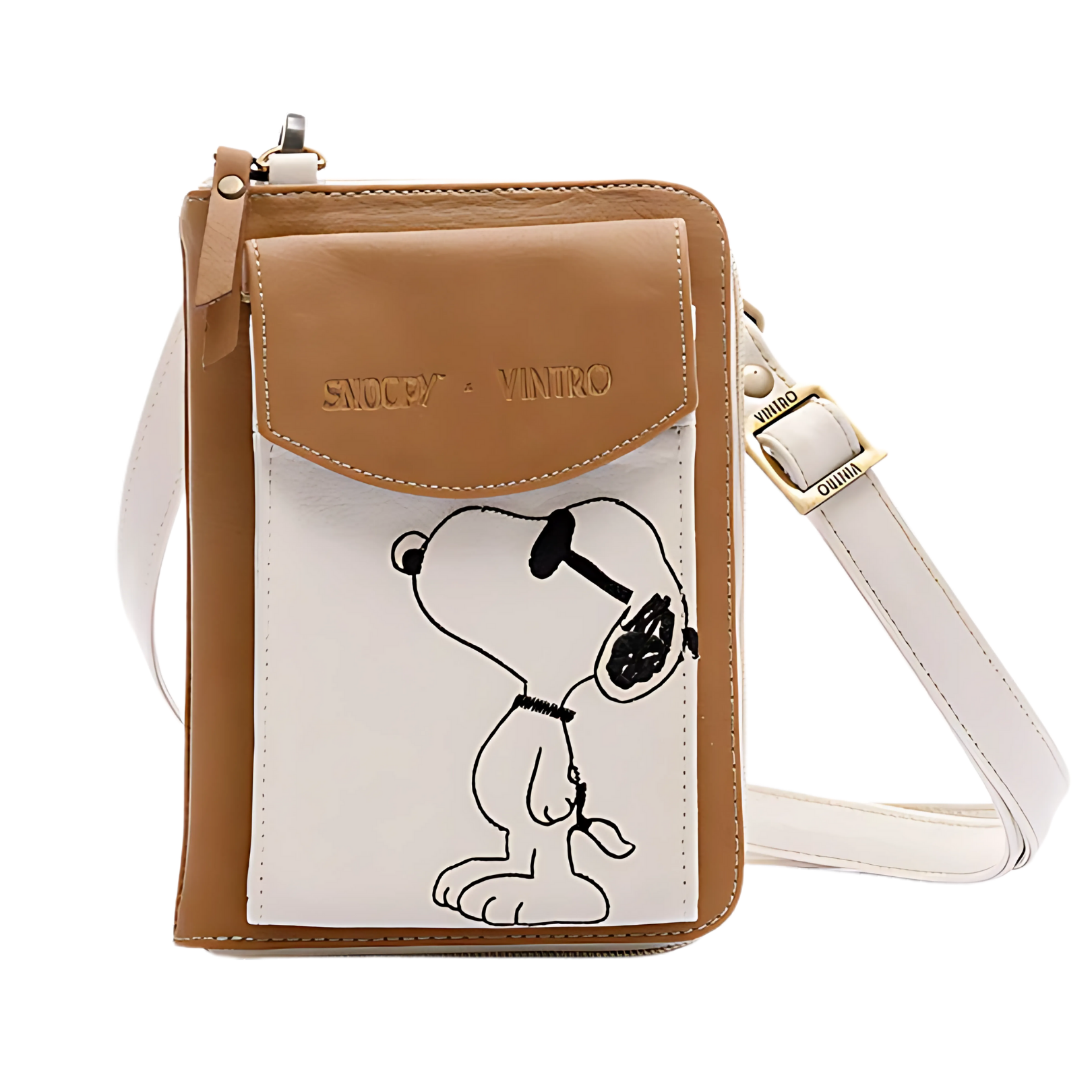 Manos libres bordado en la colección Snoopy, Cuenta con bolsillo con tapa en la parte posterior y compartimientos internos para documentos y tarjetas, bolsillo con cierre interno y cargadera removible.