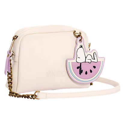Este manos libres en tono beige combina funcionalidad y un diseño encantador. Su llavero decorativo con una sandía y un Snoopy acostado le aportan un toque único y divertido. Cuenta con cargadera parcialmente en cadena y espacio suficiente para llevar tus esenciales con estilo.