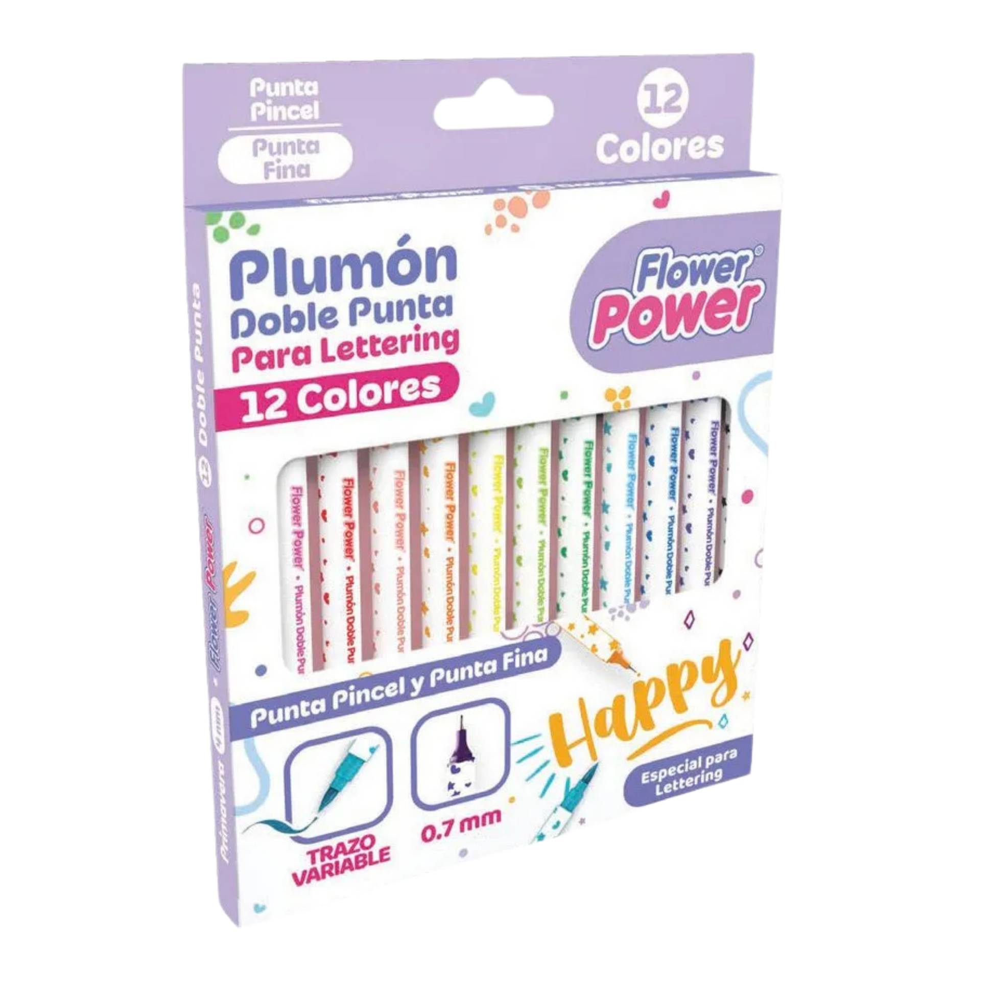 Descubre el arte en cada trazo con el Plumon Doble Punta Flower Power X 12. Este set combina 12 vibrantes colores diseñados para inspirar creatividad. Con una punta fina de 0,7 mm para detalles precisos y una punta pincel de 4,5 mm para trazos suaves y dinámicos, es ideal para darle vida a tus ideas. Su diseño ergonómico facilita el manejo, permitiéndote explorar nuevas técnicas artísticas con comodidad.