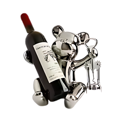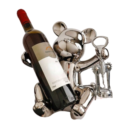 Figura decorativa en cerámica de color plateado porta botella con sacacorchos.