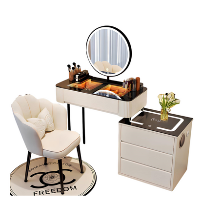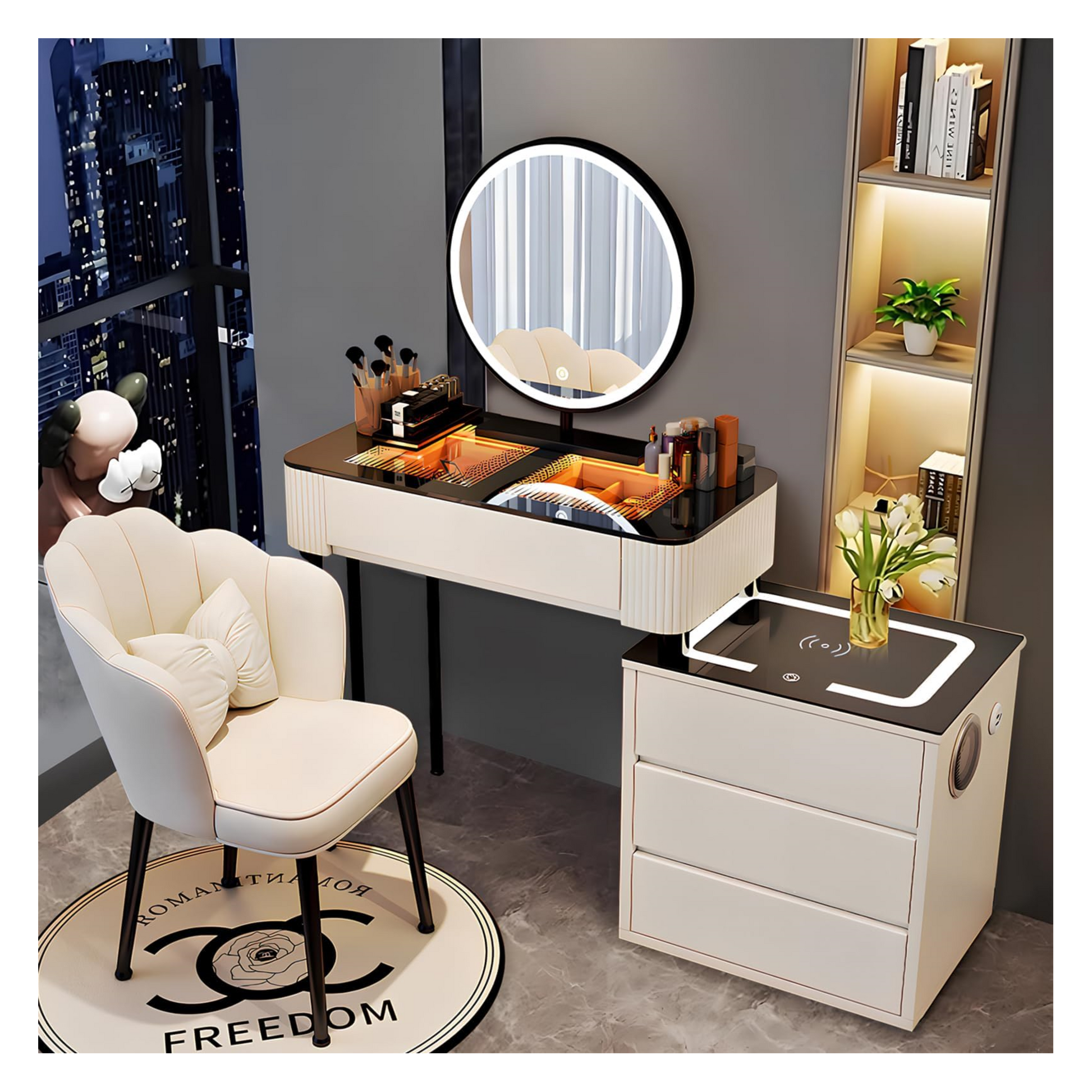 Set de peinadora inteligente, consta de: silla, espejo con luces, gavetero grande con luces, mesa de noche con luces, cargador inalámbrico y altavoz bluetooth