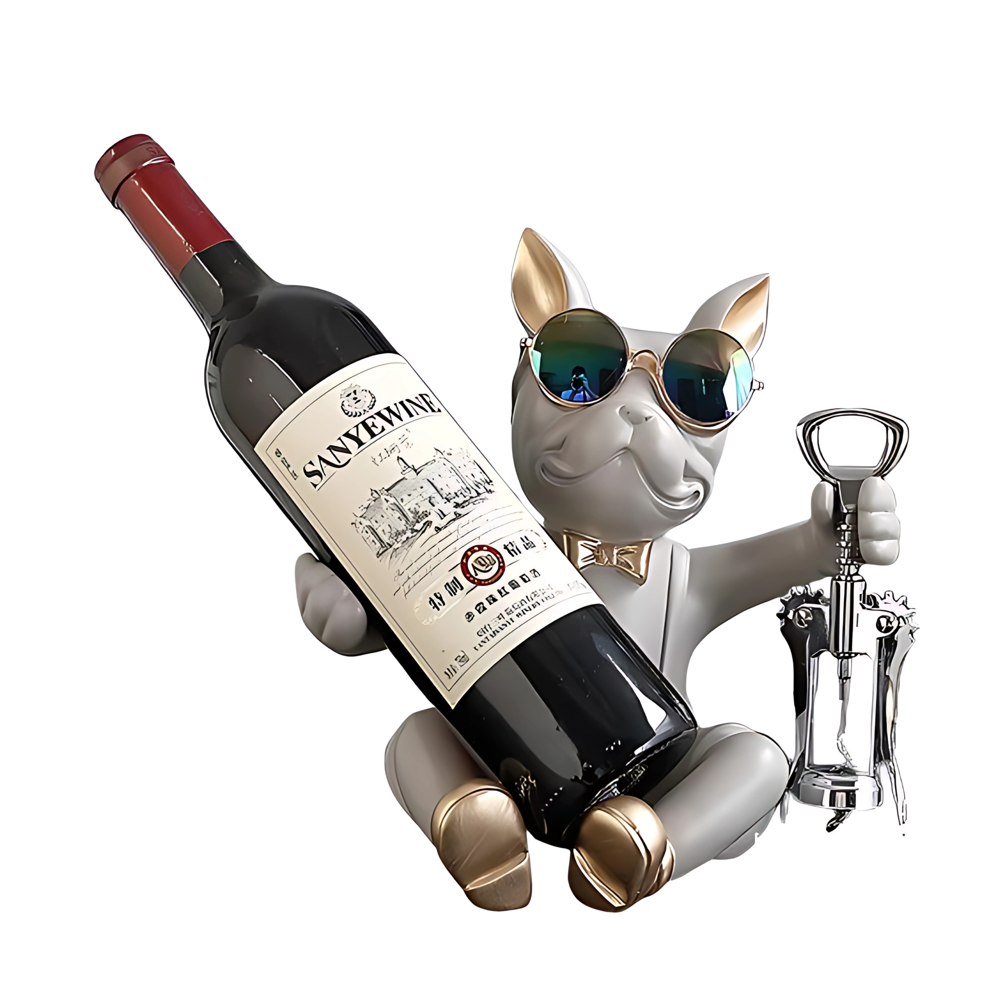 Figura decorativa de perro en resina de color gris con función de porta botella y sacacorchos.