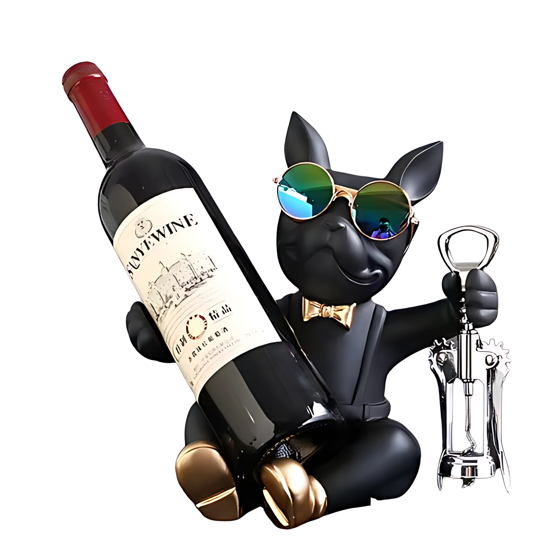 Figura decorativa de perro en resina de color negro con función de porta botella y sacacorchos