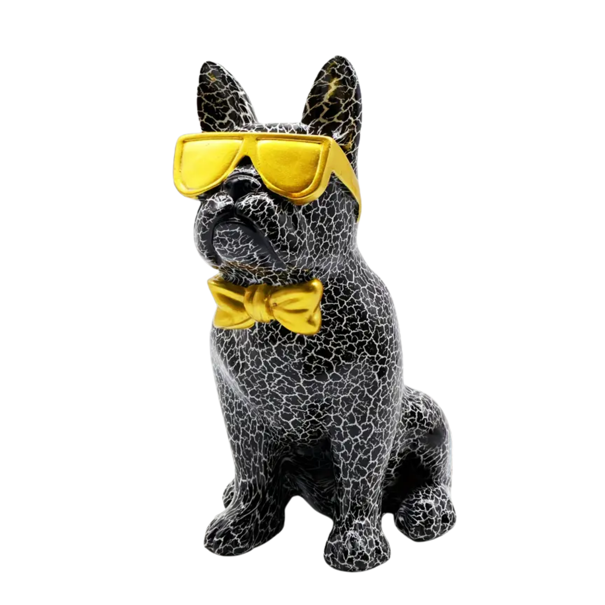 Perro decorativo de color negro con blanco con lentes y lazo dorados.