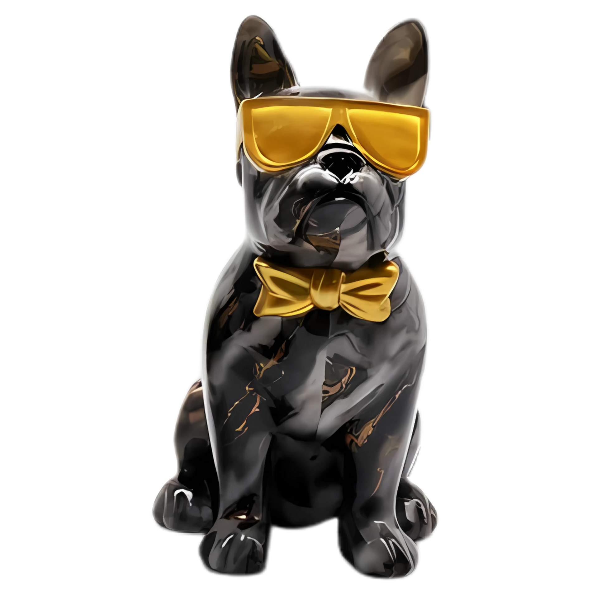 Perro decorativo de color negro marmolizado con lentes dorados y lazo dorado. |