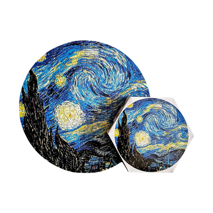 Es una versión única y desafiante de la famosa obra de Van Gogh, que representa los icónicos remolinos azules y amarillos en un formato circular, ideal para amantes del arte y rompecabezas que buscan un reto distinto, ofreciendo una experiencia relajante y decorativa con piezas de alta calidad, detalles nítidos y encaje perfecto.